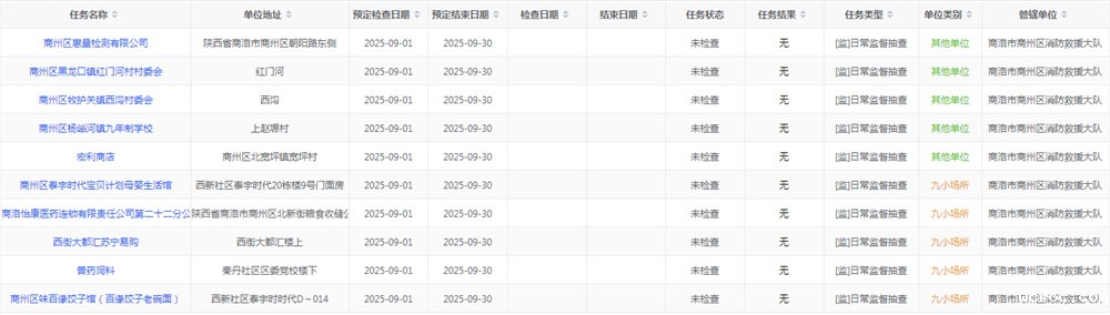 2025年9月份商洛市商州区消防救援大队“双随机、一公开”消防监督日常检查抽查单位